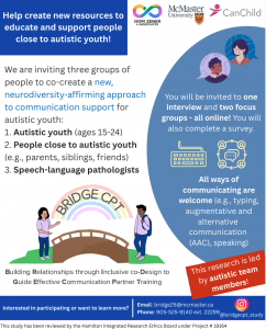 Researchers at McMaster University are aiming to co-create a new, neurodiversity-affirming approach to communication support. This study will co-design a Communication Partner Training (CPT) program with Autistic youth, close communication partners (e.g., parents, siblings, close friends), and speech-language pathologists to improve communication with Autistic youth.