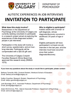 Researchers at University of Calgary are seeking volunteers to participate in a research project aimed at exploring the experiences of late-diagnosed Autistic people in job interviews. Autistic people experience much higher rates of underemployment, and job interviews are often one of the biggest obstacles.
